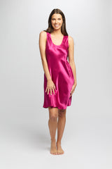 Our beautiful premium quality silk in a short nightdress in a more modest shape, with a scoop neck and wide straps. Cut on the Bias the silk drapes elegantly over the figure making it so comfortable to wear. So comfortable to wear and ideal to sleep in.