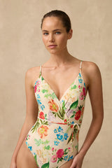 The Palermo Wrap One Piece features a cross-front design with a plunging V-neckline, soft stitched-in cups for a smooth silhouette, waist tie with brushed gold beads adjustable straps and low scooped back.