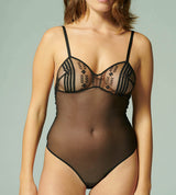 The Marthe Bodysuit is a wireless bodysuit made from sheer tulle and adorned with embroidery for a modern, feminine finish. A V-shaped neckline and embroidered cups with a horizontal dart are balanced by a slightly plunging back with embroidery on the sides. Low-cut briefs, with very fine stretch organza trim around the thighs, finish the look, while multiway straps and a snap button fastening lend versatility and practicality.