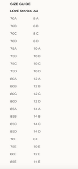 Peachie Favourites: This is really the most comfortable bra and absolutely a Peachie fav. You really don't even know you are wearing it. We find Love Stories a little softer in the back than most. You will see that their sizing is slightly different to most Australian sizing. Their Australian 10 is closer to a UK 12 etc.