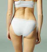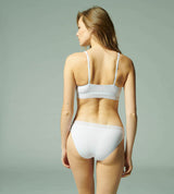 The Eugenie Bikini Brief is a ribbed modal and lace underwear style that has a front and back in ultra-soft modal, a naturally sourced material derived from wood cellulose. Soft elastic around the thighs of these panties lend comfort and support, while the waist is trimmed in Valenciennes lace, made from recycled polyamide and recycled elastane. This is lingerie with a second-skin feel.