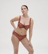 The Singuliere Bikini Brief in Sienna blends Italian tulle with French lace for an ultra-feminine statement piece. This full-coverage bikini brief features a decorative sheer mesh front with a scalloped lace trim to flatter the hips. A regular cut covers your cheeky side, while lace detailing keeps the whole look elevated and oh-so elegant.