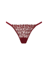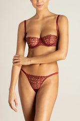 The blend of the deviously sheer leopard embroidery and the lustrous mahogany satin creates an arresting effect. The thong sits low on the hip and high on the leg for an elongated silhouette, whilst sinuous edge detailing oozes glamour.