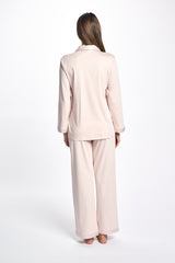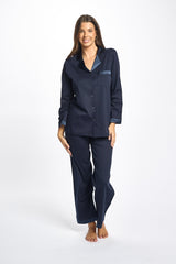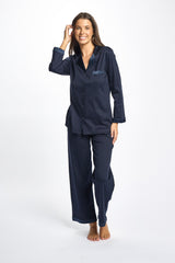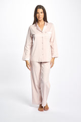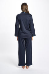 The Supima Cotton long sleeve top & matching elastic waist pant will keep you effortlessly cool & chic, completed with a collared piped silk trim translates comfortable sleepwear into easy elegance for everyday.