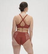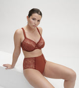 The Singuliere Full Cup Support Bra in Sienna captures the best of comfort and style in an alluring Leavers lace finish. Featuring embroidered mesh panels, lace trimmed straps and a soft, cotton lining, this deep plunging design offers full coverage and comfort combined. Bringing form and femininity, the mastery is in the detail.