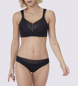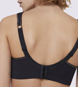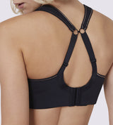 French supercoach Lucile Woodward has collaborated with Simone Perele to create this inspiringly glamorous sports range. The Harmony Underwire Sports Bra fuses femininity with unwavering support thanks to underwiring and touches of elastic lace. Glamorous in appearance, gritty in spirit, the bra is available in up to a G-size cup. Available in Black.