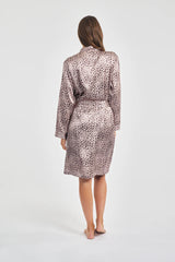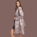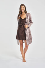 Features a wrap-around style robe with internal tie and external belt that falls below knee length. Teams perfectly with our Chemise in Chocolate or matched with Leopard.