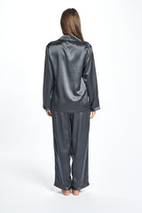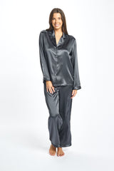 A beautiful premium quality silk piped PJ set that drapes over the figure gracefully. So comfortable to wear and ideal to sleep in. Features covered buttons and a collared neckline with a gorgeous piping detail.