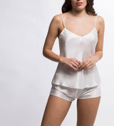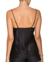The Dream Camisole in black can be worn in the bedroom or the bar. Once you feel the soft touch of silk float against your skin, you might just wear this cami top everywhere. The pure silk camisole is cut straight and finished with a handkerchief hem and soft V-neck. The classic black cami is a perfect choice for mixing and matching and can be paired with the Dream Night Short.