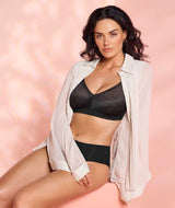 - Mid coverage two-ply cups of soft inner fabric covered with pretty dot jacquard with accent sheen