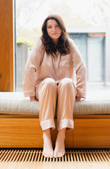 Hand Made in Australia from 100% silk in dusty pink with contrast ivory satin piped trim. A timeless classic, designed to be worn as leisurewear...day or night.