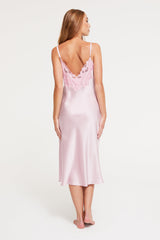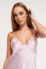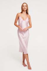Lace V-Neck Slip in Hyacinth. Where Loungewear meets Ready to Wear. The Lace V-Neck Slip is a midi length slip style in pure sillk with a lace trim. The bust is carefully shaped to frame the bust and fall fluidly from the high-waist. Makes for luxurious loungewear, or ready to wear style.