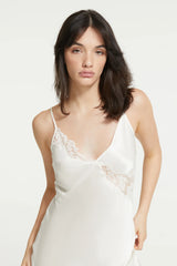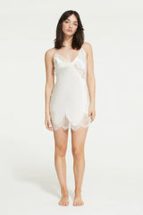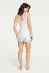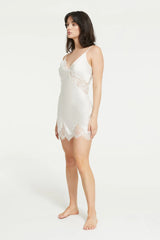 The Minx story combines delicate lace detailing and creme silk with plunging necklines and cutaways. The Minx Chemise is a v-neck style with lace trims across the body and hem that falls to the mid-thigh. Spaghetti straps of the same silk are adjustable for a perfect fit.