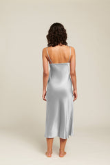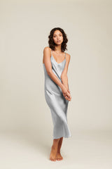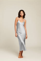 Pearl Blue Silk Nite, a part of the Core collection, featuring lightweight silk in a midi length, bias cut, v-neck, and thin adjustable straps.
