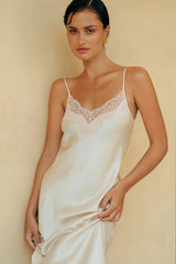 The Silk Lace Slip is an enduring romance, made in soft silk and detailed with delicate hand-cut lace to celebrate the female form. A classic V-neck slip style that falls to the mid-calf. Spaghetti straps from the same silk are adjustable for a perfect fit. Silk Basics by GINIA are modern silk essentials for every day. A collection of beautifully curated pieces that work independently and in combination. Designed to be worn and loved every day.