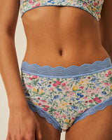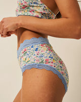 High Rise Knicker in Summer Garden finished with lace trim, packaged with love in a gift box.