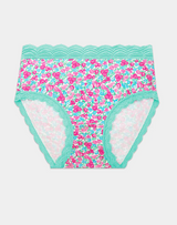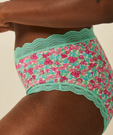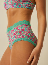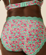 High Rise Brief in Neon Meadow finished with lace trim, packaged with love in a gift box.