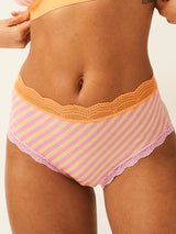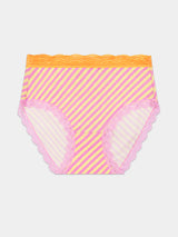 High Rise Knicker in Pick N Mix Stripe finished with lace trim, packaged with love in a gift box.