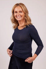 This Modal Cashmere Long Sleeve Top / women's spencer thermal wear, is luxurious, Italian-made thermal underwear for women. Made from a gorgeous mix of Modal, a soft, natural fiber made from beech trees, and luxurious Cashmere. Wearing this, is like dressing yourself up in a warm hug! The fabric feels delicate to the touch and just wraps to the curves of your body due to the added Elastane and snaps back into shape when washed according to the directions. The ivory colour is a warm, off-white colour and available in a range of ongoing and seasonal colours.