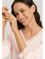 Indulge in luxury with the HANRO Moments 3/4 Sleeve Nightdress. Crafted from 100% mercerised interlock cotton, this special gown ensures a silky-smooth sensation with a beautiful sheen. The opaqueness of the fabric offers a subtle hint of modesty, while the lavish lace trim at the neckline and sleeve hems infuses a touch of elegance to the Sleepshirt. Treat yourself to a night of luxurious comfort and femininity.